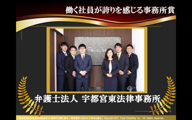 2023年、全国の法律事務所が集まる船井総合研究所の「法律事務所研究会合同総会(法律事務所経営研究会、企業法務研究会、人身傷害業務研究会、相続遺言業務研究会)」において、事務所経営の中核となるPMVVを策定するだけでなくこれを所内に浸透させて、開業からわずか8年で県内最大規模の法律事務所にまで成長した点などを評価していただき、全体MVPである「エクセレントローファーム賞」を受賞